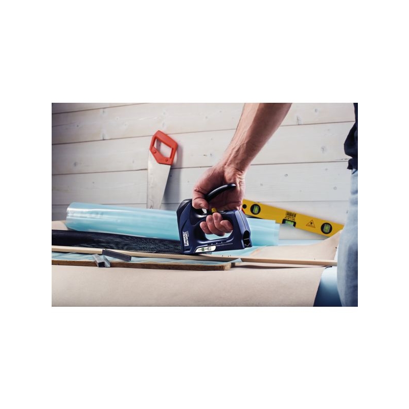 Idéale pour la pose de matériaux isolants, moquette. Corps en aluminium. Chargement par le dessous. Utilise des agrafes n°140 de 6 à 14 mm et des pointes n°8 de 15 mm. Chargeur : 84 agrafes/90 pointes Poids : 600 g