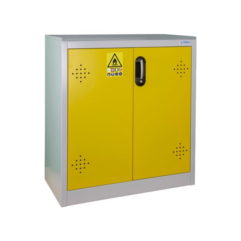En acier monobloc avec portes battantes à 110°. Fournie avec pictogrammes normalisés. Orifices de ventilation. Fermeture à clé en 3 points. Étagères et bacs de rétention réglables en hauteur sur crémaillères, au pas de 15 mm. Armoire haute à 4 étagères ou basse à 2 étagères. Plan de travail des armoires comptoirs recouvert par un tapis en caoutchouc. Conforme aux articles R5132-66 et R5132-68 du Code de la Santé Publique. Conforme aux recommandations de l'INRS. Charge admissible par étagère : 80 kg UR Coloris : corps gris et portes jaunes Existe avec portes rouges, bleues ou vertes, nous consulter.