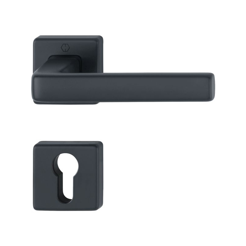 Pour porte intérieure d'épaisseur 37 à 47 mm. Garniture avec ressort de rappel à double sens, bague de guidage sans entretien. Fixations non visibles. Dimension rosaces : Ø 44 mm Épaisseur rosaces : 8 mm Longueur béquille : 120 mm Saillie de la béquille : 40 mm Fouillot carré : 7 mm Finition : noir mat Conditionnement : boîte Colisage : carton de 10 boites de 2 pièces