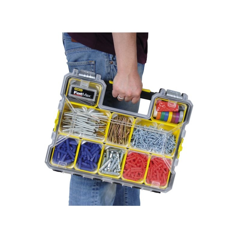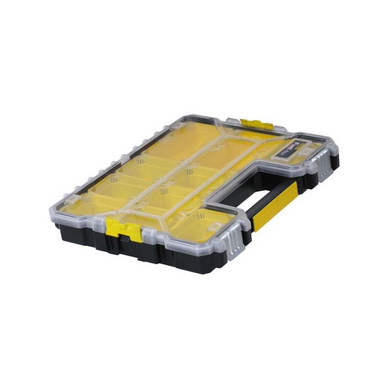 Compartiments amovibles. Couvercle avec encoche pour le maintien des compartiments. Larges attaches métalliques Accroches latérales pour assembler plusieurs organiseurs et faciliter le transport. Etanche à l'eau et à la poussière (IP53). Livrée vide.
