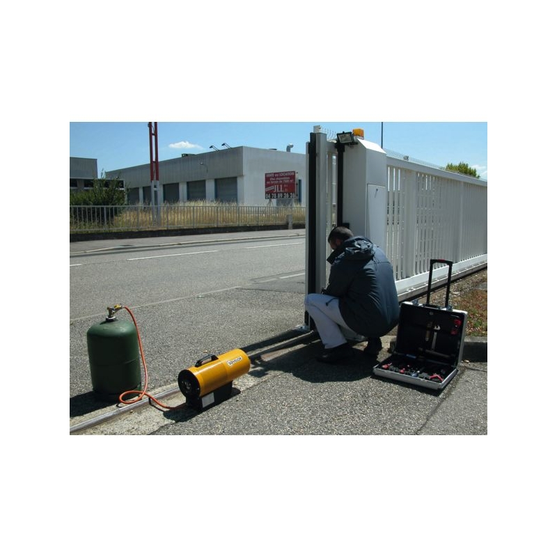 Utilisation intérieure et extérieure dans des locaux bien ventilés. Combustion directe. A commande manuelle. Équipé d'une sécurité de surchauffe, d'une sécurité stop-gaz, de 2 grilles de protection sur l'aspiration et le soufflage et d'un contrôle de flamme par thermocouple. Puissance réglable par vanne. Se fixe directement sur une bouteille de gaz propane. Puissance calorifique : 18 à 33 kW Alimentation : 230 V Débit d'air : 1000 m³/h Poids : 8 kg Tuyau souple, manodétendeur gaz, câble et prise électrique inclus.