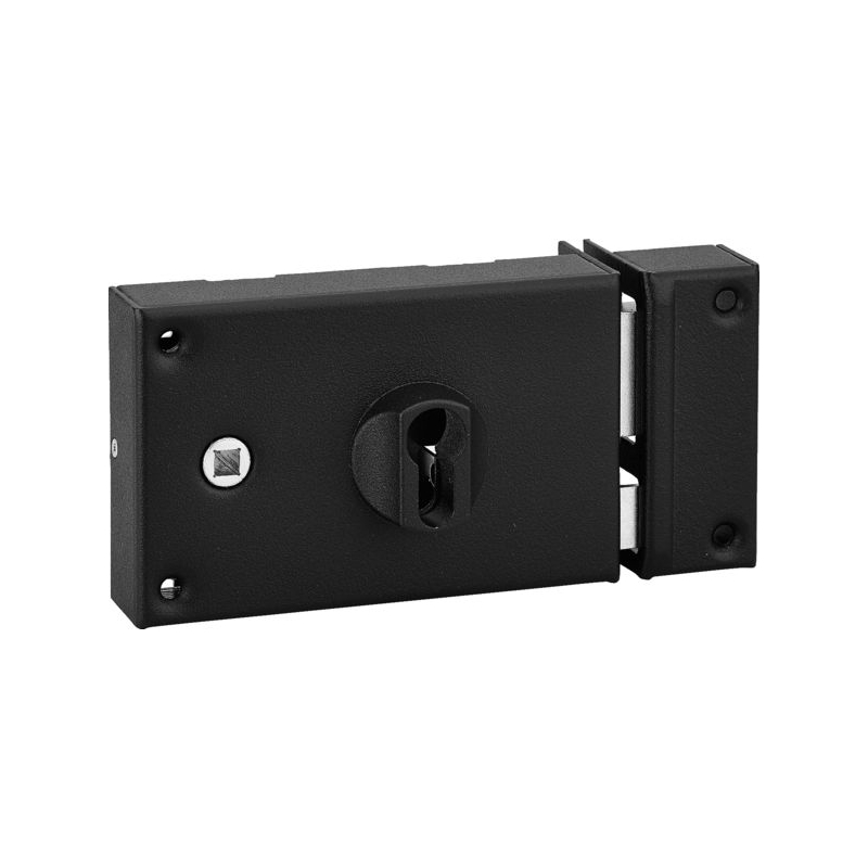 Pour cylindre profilé. En acier cambré. Pêne et ½ tour en acier zingué. Mécanisme à 2 tours. Livré avec gâche, sans cylindre. Coffre : 140 x 88 mm Entraxe : 55 mm Fouillot carré : 7 mm Finition : époxy noir Conditionnement : boite