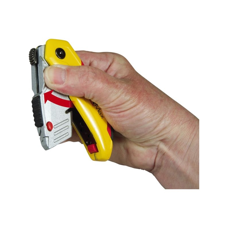 Couteau pliable et compact à ouverture d'une seule main. Changement facile et rapide de la lame. Lame rétractable. Poignée bi-matière. Réservoir de lames intégré. Livré avec 3 lames trapèze.