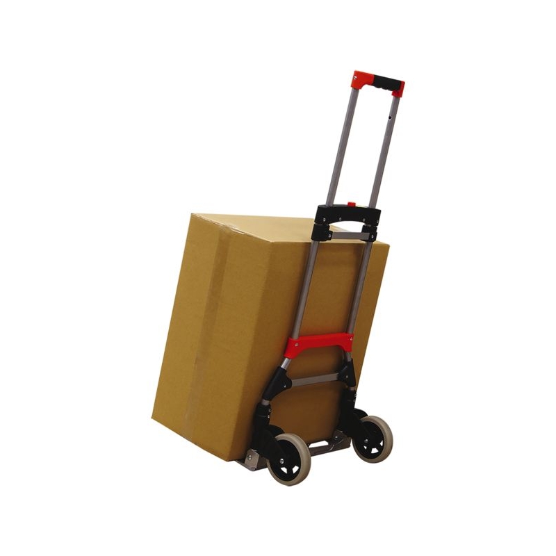 Télescopique et pliable avec poignée de préhension ergonomique. Roues polyuréthanes Ø 125 mm. Capacité de charge : 80 kg Dim. H x l replié/déplié : 770 x 390/1020 x 390 mm Dim. bavette pliable : 390 x 280 mm Poids : 3,600 kg