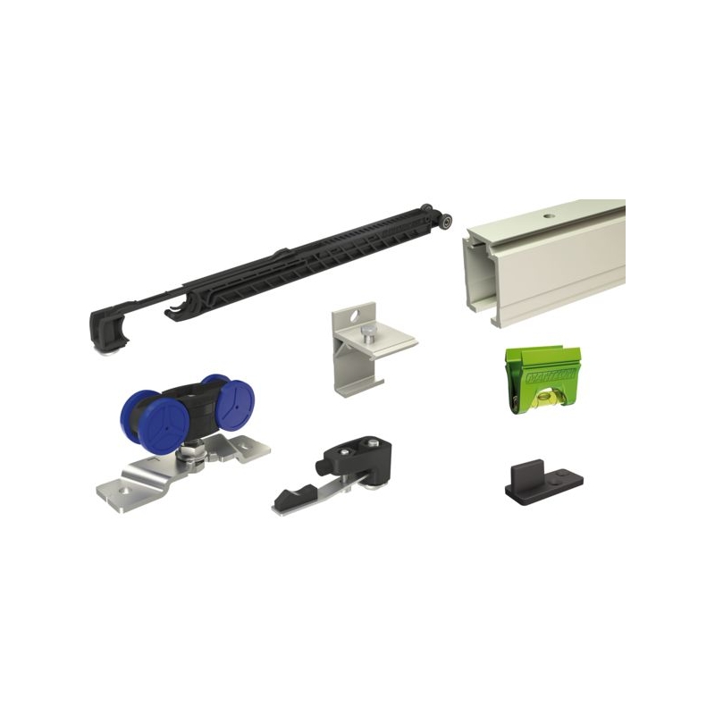 Garniture pour 1 porte de 81 à 120 Kg maxi comprenant : - 2 montures 13232 (montées sur roulements à billes), - 2 platines 13036, - 2 butées d’arrêt réglables 11213, - 1 guide au sol 1103R, - 1 Buly (niveau à bulle). Conditionnement : boîte Colisage : 6 pièces