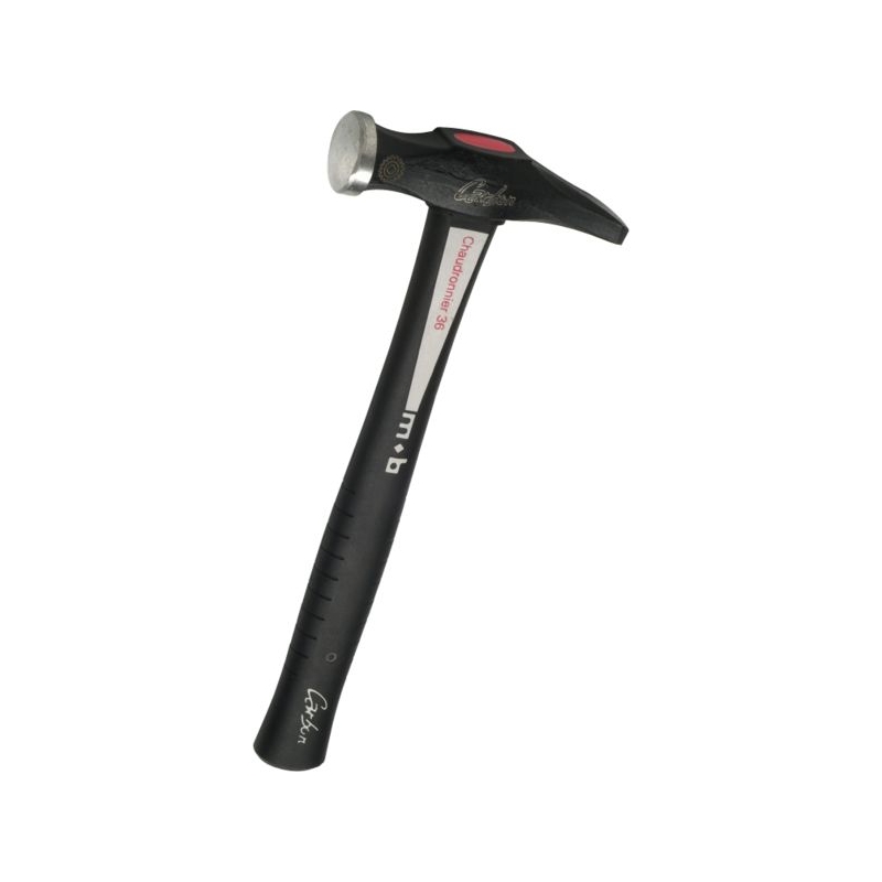 Tête ronde en acier forgé. Emmanchement haute sécurité. Coin métallique de sécurité anti-éjection. Bague de protection contre les faux-coups. Manche Hickory.