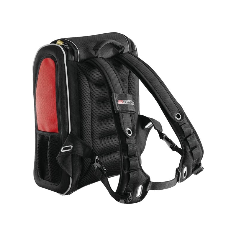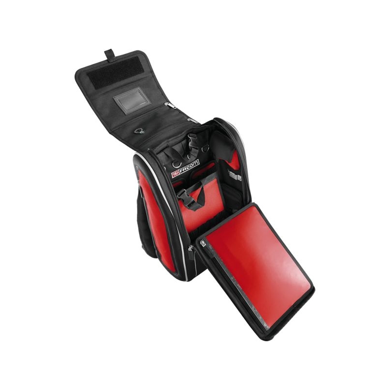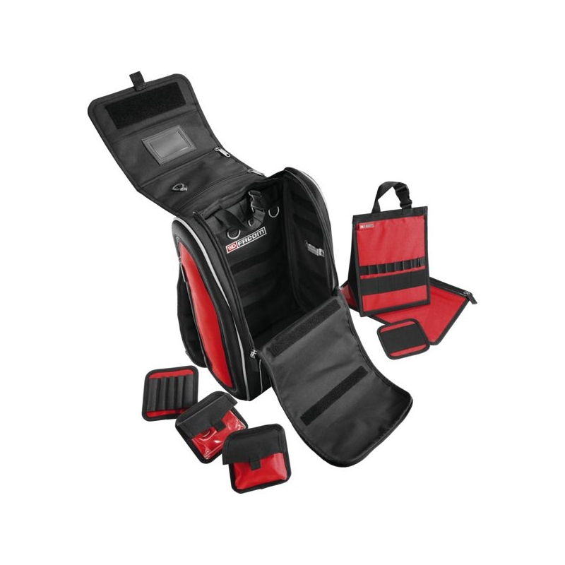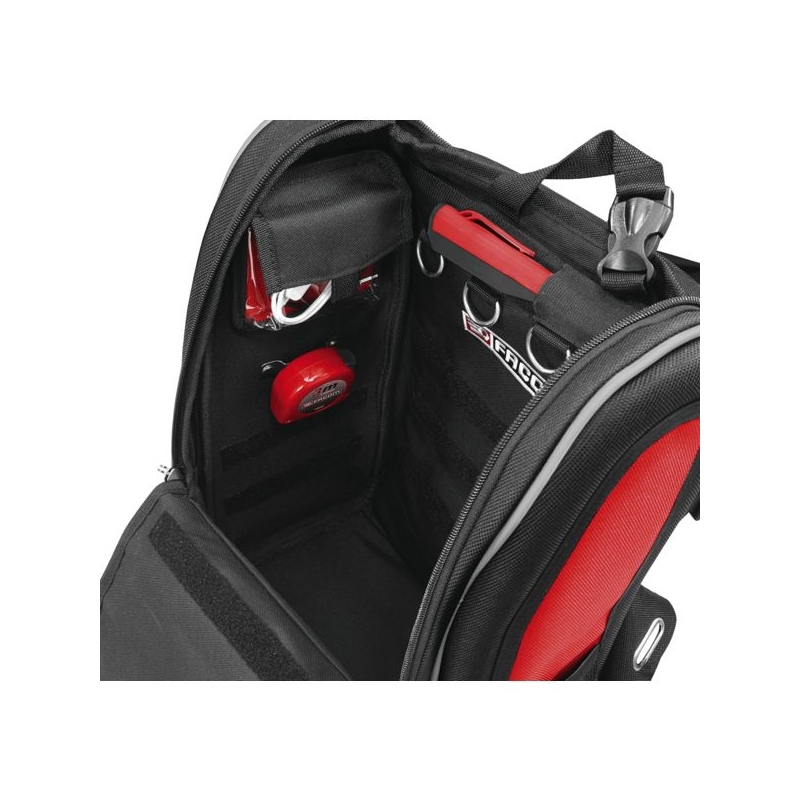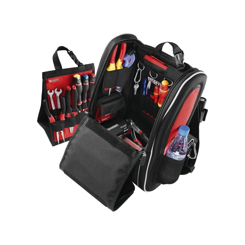 Permet de passer dans des espaces confinés. Compatible avec les échelles à crinoline. Fermetures à glissières cadenassables. Pochettes de rangement amovibles à positionnement libre grâce aux bandes de fixation (Velcro), avec élastique pour les outils. œillets extérieurs ovales pouvant porter jusqu'à 0,5 kg chacun. Bretelles matelassées, ergonomiques, poignée sur le dessus. Bandes réfléchissantes sur l'avant et les côtés. Charge maxi : 10 kg Dimensions : 300 x 180 x 480 mm Livré sans outils.
