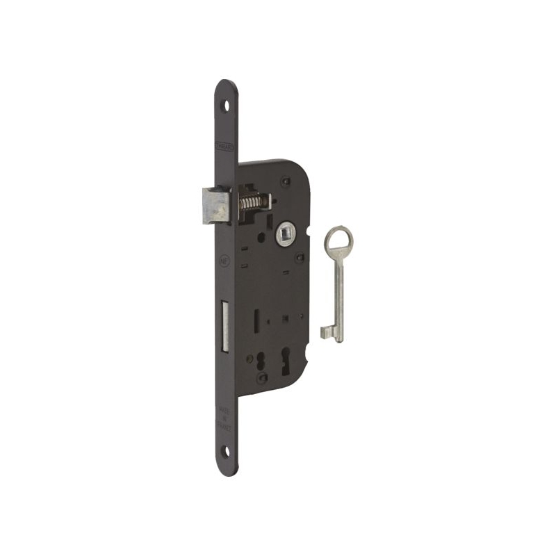 Pêne ½ tour réversible sans démontage. Livrée avec gâche. Existe en noir, nous consulter. Coffre acier embouti : 135 x 59 mm Têtière acier bouts ronds : 230 x 20 mm Axe : 40 mm Entraxe : 70 mm Fouillot carré : 7 mm Norme : NF P 26-409 Finition : époxy blanc Conditionnement : boite