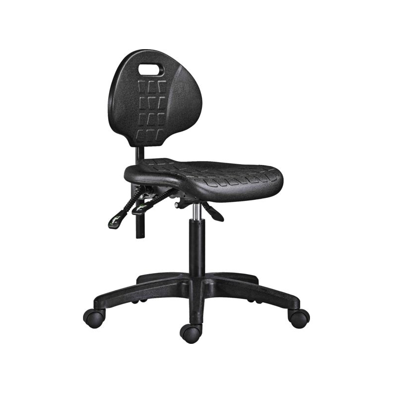 Assise et dossier en bois multiplis recouvert de polyuréthane. Dossier à contact permanent réglable en hauteur. Vérin à gaz, piétement à 5 bras avec patins ou roulettes. L x P : 43 x 46 cm Hauteur assise standard : 420/560 mm Hauteur assise haute : 560/810 mm